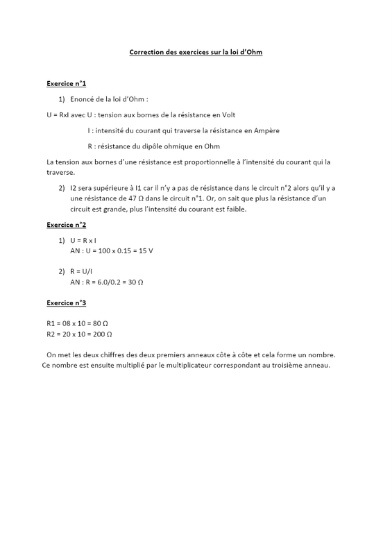 Je vous dépose la correction des exercices sur la loi d'Ohm.
